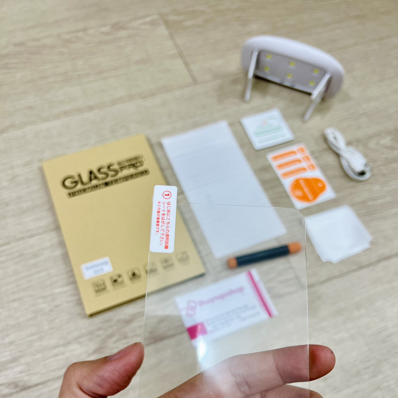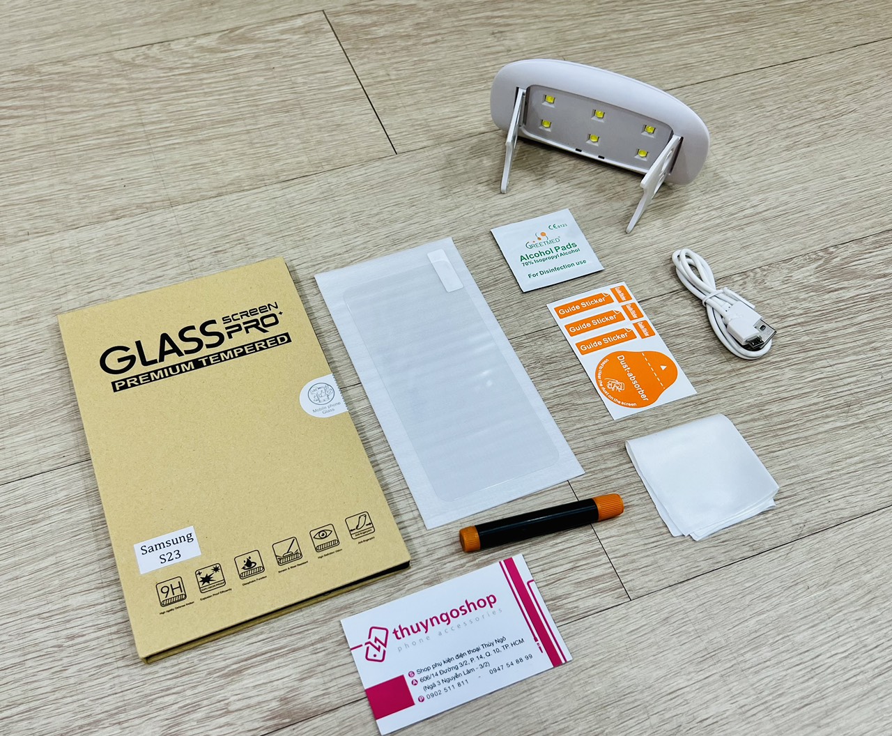 - 1 bộ bao gồm: 1 kính cường lực, 1 lọ keo, 1 bộ vệ sinh màn hình, 1 đèn UV mini